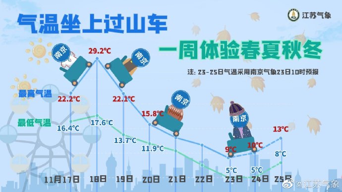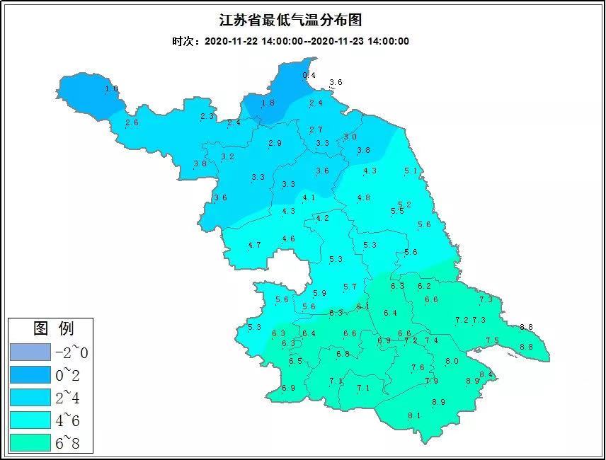 “江蘇南北差異大,往年入冬都是自北向南逐步推進。比如以往南京一般在11月下旬,淮北地區(qū)一般在11月中旬。但未來幾天溫度還在不斷起伏,氣溫有升有降。預計,受下一輪冷空氣影響,29日、30日淮北地區(qū)的最低氣溫降到-3℃左右,沿江和蘇南地區(qū)預計3℃左右,其它地區(qū)維持在1℃到2℃。”吳海英介紹。