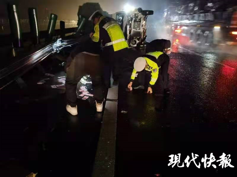 高速上追尾撒落一地百元大鈔 交警冒雨撿回三萬多元