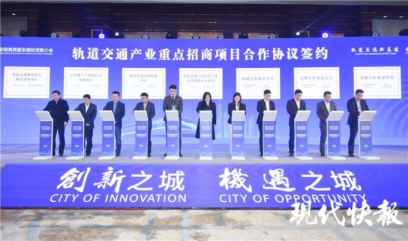 (記者 盧河燕 文/攝)11月27日,“‘鏈’上南京——2020南京軌道交通產(chǎn)業(yè)鏈高質(zhì)量發(fā)展投資推介會”舉行。現(xiàn)場不僅介紹了南京軌道交通產(chǎn)業(yè)發(fā)展情況,推介產(chǎn)業(yè)投資環(huán)境,還簽約了一批軌道交通產(chǎn)業(yè)重點招商項目合作協(xié)議?,F(xiàn)代快報記者了解到,今年南京軌道交通產(chǎn)業(yè)預(yù)計營收突破800億元。