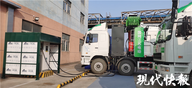 現(xiàn)場(chǎng),15輛新能源重卡一字排開(kāi),都已經(jīng)換上了新能源車(chē)牌,車(chē)一旁還配備了直流充電樁。國(guó)電南瑞科技股份有限公司南京用電技術(shù)分公司副總經(jīng)理張浩告訴記者:“從司機(jī)操作的角度來(lái)說(shuō),完全沒(méi)有區(qū)別。一輛車(chē)充滿(mǎn)一共280度電,一般可以行駛120-150公里。從港口到堆場(chǎng)都是幾公里的路程,行駛里程比較短。充一次電,可以滿(mǎn)足大半天的需求。”在直流充電樁旁,他解釋道:“現(xiàn)在的充電樁基本采取快充的方式,如果這輛車(chē)還剩下不到30%的電,插上充電,不到1小時(shí)就能充滿(mǎn)了。它還可以通過(guò)頂部吊裝的方式換電池,就更快了,幾分鐘就能完成。”