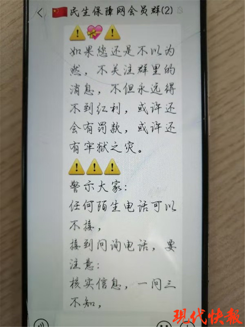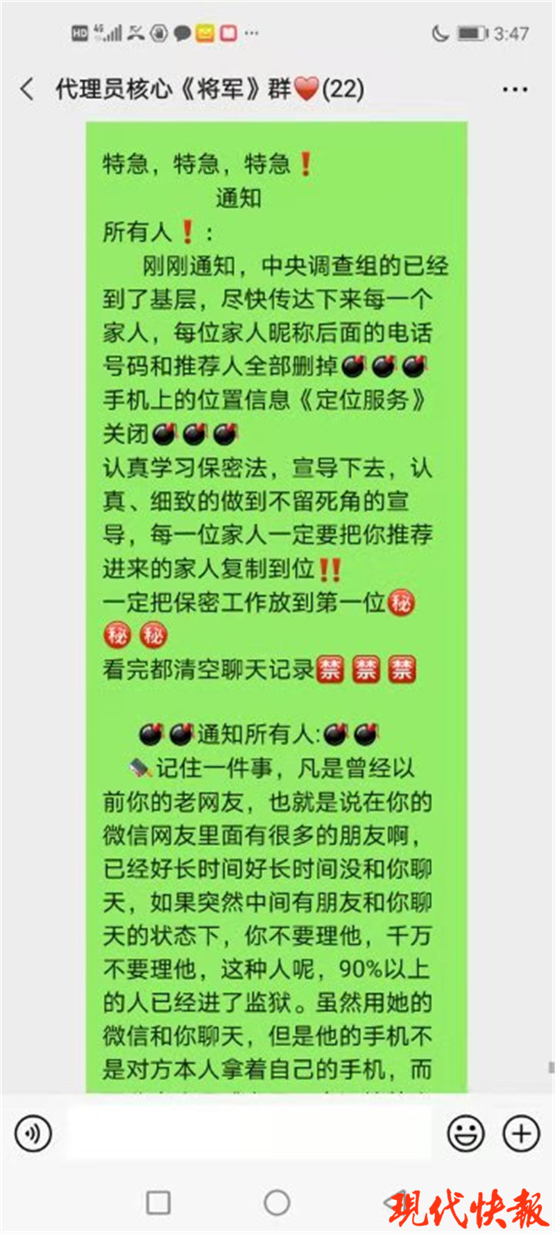 辦案民警介紹,該犯罪團(tuán)伙假借國(guó)家政策和社會(huì)熱點(diǎn),宣稱(chēng)“民生保障網(wǎng)”為國(guó)家精準(zhǔn)扶貧項(xiàng)目,只要繳納3400元的“入網(wǎng)費(fèi)”后便可成為會(huì)員,享受債務(wù)清零、征信洗白和高額返利等“國(guó)家福利”。他們利用互聯(lián)網(wǎng)社交工具,在微信群內(nèi)傳發(fā)所謂“中央文件”“領(lǐng)導(dǎo)講話”“官方新聞”,對(duì)團(tuán)伙成員進(jìn)行傳銷(xiāo)式“洗腦”,以小投入獲得大回報(bào)為誘餌實(shí)施犯罪,在短短4個(gè)月內(nèi)已發(fā)展成一個(gè)人數(shù)眾多、層級(jí)分明的跨省市犯罪團(tuán)伙,各層級(jí)均有相應(yīng)的代理商、統(tǒng)計(jì)員、講師及收款員等角色。經(jīng)查證,該案中的“民生保障網(wǎng)”項(xiàng)目確為公安部公布的“人際網(wǎng)”項(xiàng)目“改頭換面”的產(chǎn)物。