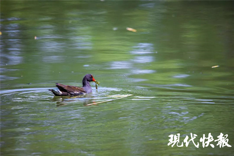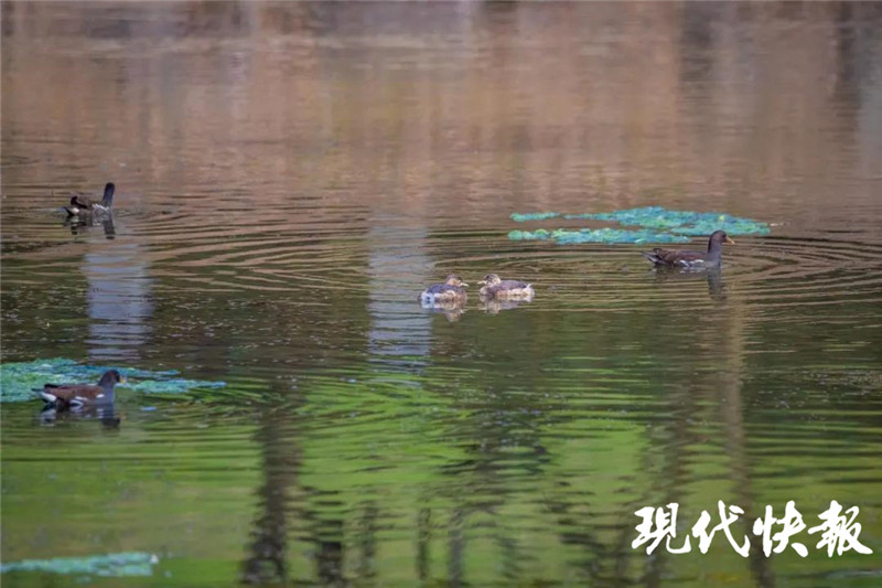 外形和鴨子一樣的䴙䴘比較常見,全湖可見。它們比較膽小,常常在蘆葦叢中營巢,或者成群在水上游蕩。通體黑褐色的黑水雞多在荷花種植區(qū)內活動。
