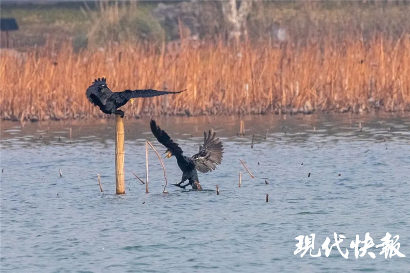 現(xiàn)代快報記者在湖畔看到,一大群鸕鶿棲息在湖面的圍欄上,或是伺機捕魚,或是展開翅膀晾曬羽毛,烏黑的羽翼在陽光下泛著光澤。記者了解到,從11月初起,鸕鶿就會準時來玄武湖過冬,進入12月數(shù)量開始增多,每年都在50只以上,多的年份會超過100只。