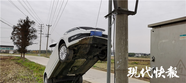 民警現(xiàn)場(chǎng)詢(xún)問(wèn)駕駛員范女士得知,其在楊家橋村由南向北行駛時(shí),由于村道比較窄小,對(duì)路況又不熟悉,在避讓其他車(chē)輛時(shí)沒(méi)看清旁邊電線桿斜拉的鋼絲繩,不小心將車(chē)開(kāi)到了鋼絲繩上,并順著鋼絲繩開(kāi)了兩米多高才熄火停下。