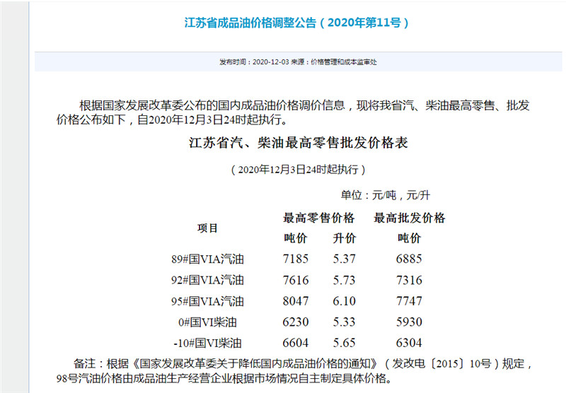 12月3日24時起 江蘇92號汽油漲至5.73元/升