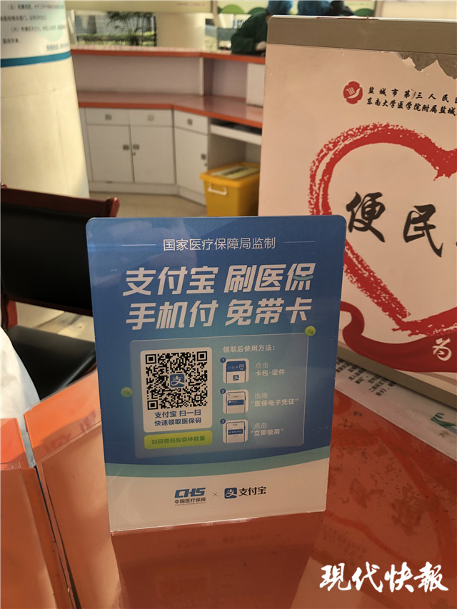 當天上午,現代快報記者來到鹽城市第三人民醫(yī)院門診大廳,只見便民服務臺的旁邊放著醫(yī)保電子憑證的宣傳標語,工作人員正耐心指導就醫(yī)人員使用醫(yī)保電子憑證。