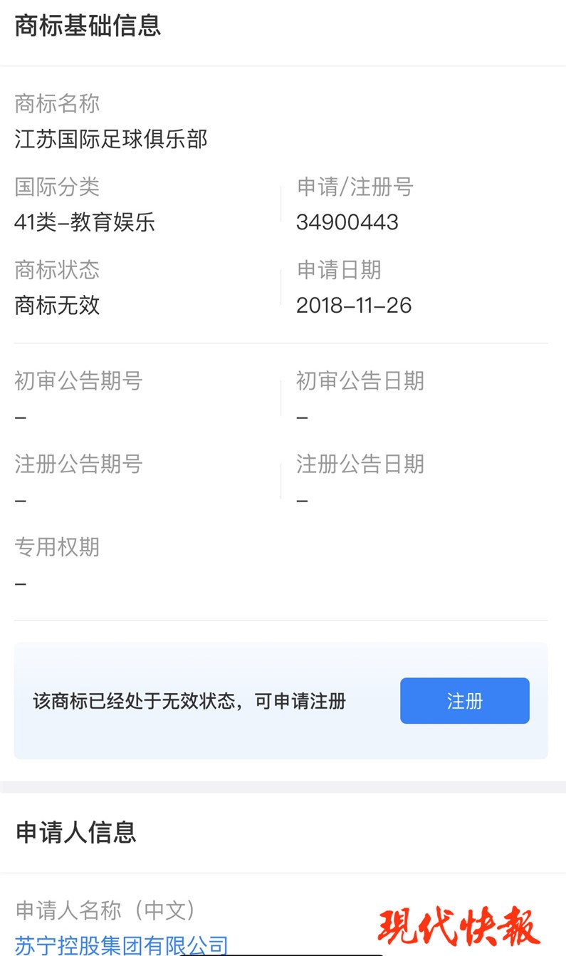 現(xiàn)代快報記者查詢“天眼查”發(fā)現(xiàn),早在2018年11月26日,蘇寧控股集團有限公司就申請注冊了“江蘇國際足球俱樂部”這一名稱。據(jù)傳,這個名字也得到了不少蘇寧高層的青睞。但“江蘇國際”也有一個劣勢,據(jù)記者了解,這一名稱雖然注冊足球俱樂部沒有問題,但很難被注冊成為商標。目前,“天眼查”顯示,“江蘇國際足球俱樂部”商標狀態(tài)仍為“無效”。不過,像“大連人”“深圳市足球俱樂部”等,也顯示商標注冊無效。綜合來說,江蘇國際仍是江蘇蘇寧更名進程中最具競爭力的名字。