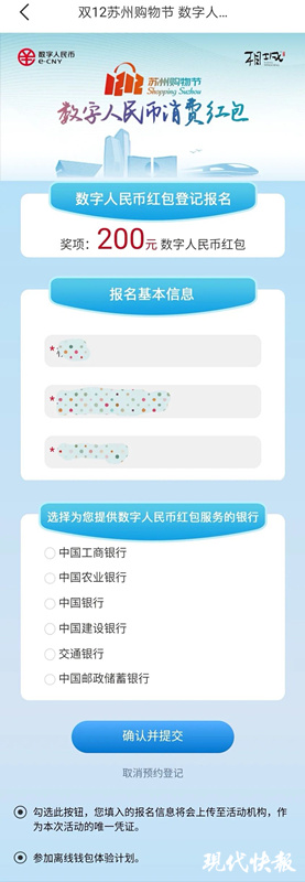 值得注意的是,滿足以上兩個(gè)條件之一的個(gè)人,可以在12月5日0時(shí)至12月6日24時(shí)期間,通過“蘇周到”APP的“雙12紅包”入口,進(jìn)行預(yù)約報(bào)名登記。12月11日,預(yù)約報(bào)名人員可以通過“蘇周到”APP查詢中簽結(jié)果,系統(tǒng)也將根據(jù)報(bào)名時(shí)預(yù)留的手機(jī)號(hào)碼通過短信通知到中簽人員。中簽人員根據(jù)操作指引下載“數(shù)字人民幣”APP、開立個(gè)人數(shù)字人民幣錢包、領(lǐng)取消費(fèi)紅包。