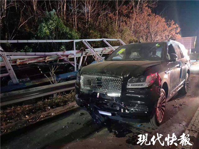 12月9日18時(shí)許,接到報(bào)警后民警到達(dá)事故現(xiàn)場,發(fā)現(xiàn)一輛15米多長的運(yùn)輸車側(cè)翻在護(hù)欄外的綠化帶,車頭已經(jīng)凹下去了一半,運(yùn)輸?shù)?輛林肯SUV已經(jīng)被甩出,損壞嚴(yán)重,應(yīng)急車道邊上的護(hù)欄也被撞得脫落,現(xiàn)場一片狼藉。