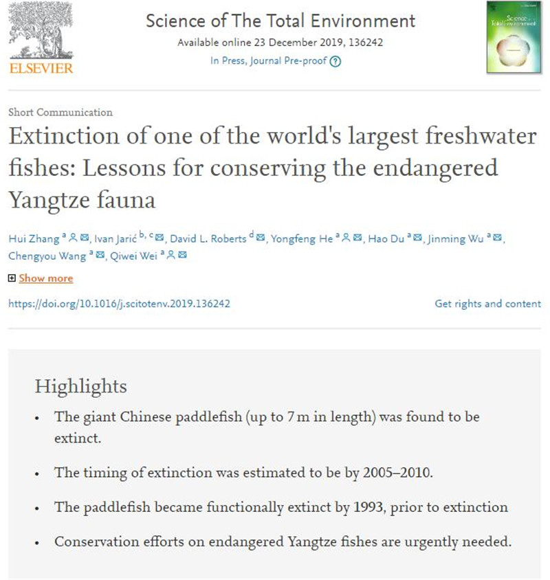 △論文《世界最大淡水魚之一可能滅絕:拯救長江瀕危魚類刻不容緩》截圖