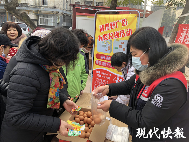 (通訊員 羅津菁 記者 張曉培)“每10張野廣告可兌換1個(gè)雞蛋。”近日,在徐州市泉山區(qū)永安街道紡南社區(qū)黨群服務(wù)中心門(mén)口,居民孫阿姨剛剛完成了一筆“交易”,她將從自家樓棟里清理下來(lái)的野廣告交給社區(qū)工作人員清點(diǎn),“清理了30多張小廣告,換了3個(gè)雞蛋,這買(mǎi)賣值。”孫阿姨拿著雞蛋高興地說(shuō)。