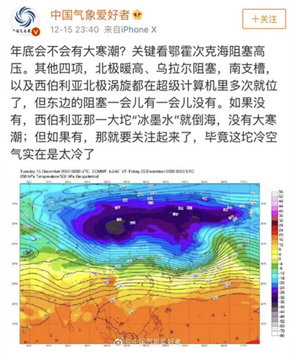 早在12月15日,知名科學科普博主@中國氣象愛好者就在微博上曬出了一張氣象圖,并配文“年底會不會有大寒潮?關(guān)鍵看鄂霍次克海阻塞高壓。其他四項,北極暖高、烏拉爾阻塞,南支槽,以及西伯利亞北極渦旋都在超級計算機里多次就位了,但東邊的阻塞一會兒有一會兒沒有。如果沒有,西伯利亞那一大坨‘冰墨水’就倒海,沒有大寒潮;但如果有,那就要關(guān)注起來了,畢竟這坨冷空氣實在是太冷了 。”