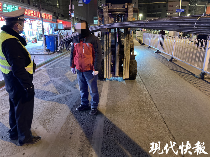 當(dāng)天晚上10點(diǎn)多鐘,在徐州市復(fù)興南路上,叉車“舉著”6米長(zhǎng)的一捆鋼筋在機(jī)動(dòng)車道上行駛,鋼筋顫顫悠悠,十分危險(xiǎn)。徐州鼓樓交警大隊(duì)五中隊(duì)的民警巡邏發(fā)現(xiàn)后,立即在復(fù)興北路上將其攔下,避免了交通事故的發(fā)生。