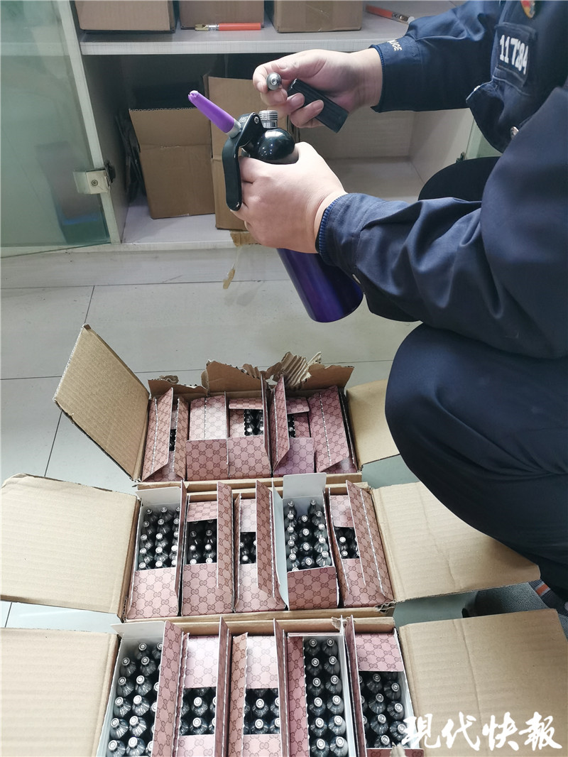 津津被抓獲后,民警連夜開展審查工作。根據(jù)津津的供述,民警順藤摸瓜,經(jīng)研判分析當晚鎖定了另一名嫌疑人強強(化名)以及剩余“笑氣”的存放窩點。