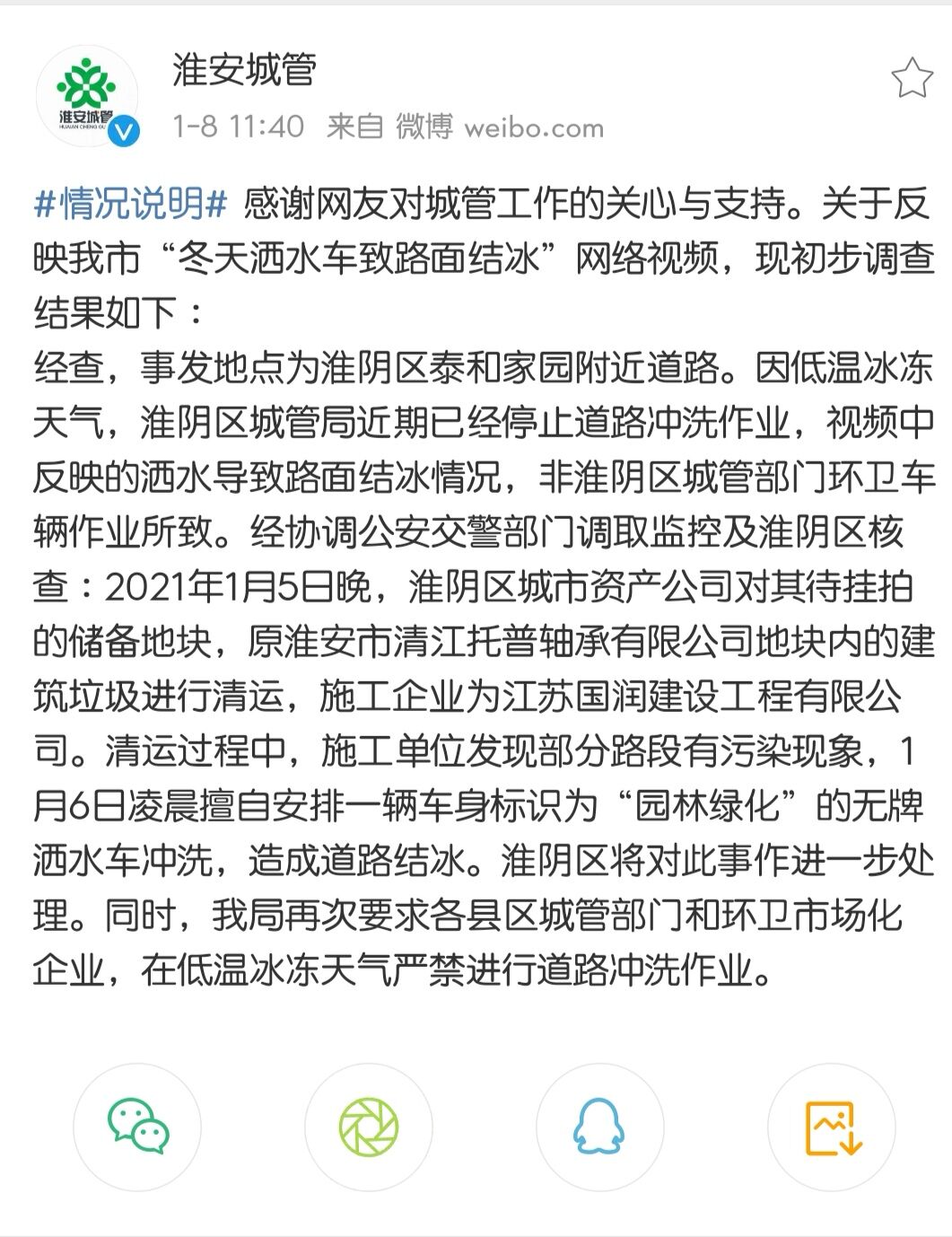 淮安城管表示,經(jīng)查,事發(fā)地點(diǎn)為淮陰區(qū)泰和家園附近道路。因低溫冰凍天氣,淮陰區(qū)城管局近期已經(jīng)停止道路沖洗作業(yè),視頻中反映的灑水導(dǎo)致路面結(jié)冰情況,非淮陰區(qū)城管部門環(huán)衛(wèi)車輛作業(yè)所致。經(jīng)協(xié)調(diào)公安交警部門調(diào)取公共視頻及淮陰區(qū)核查發(fā)現(xiàn),1月5日晚,淮陰區(qū)城市資產(chǎn)公司對(duì)其待掛拍的儲(chǔ)備地塊,原淮安市清江托普軸承有限公司地塊內(nèi)的建筑垃圾進(jìn)行清運(yùn),施工企業(yè)為江蘇國(guó)潤(rùn)建設(shè)工程有限公司。清運(yùn)過程中,施工單位發(fā)現(xiàn)部分路段有污染現(xiàn)象,1月6日凌晨擅自安排一輛車身標(biāo)識(shí)為“園林綠化”的無牌灑水車沖洗,造成道路結(jié)冰。
