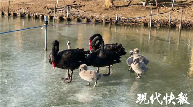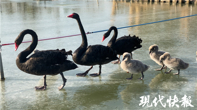 現(xiàn)代快報記者了解到,為了能讓黑天鵝們安心過冬,飼養(yǎng)員特意增加了采食點,并增加喂食次數(shù)。同時,飼養(yǎng)員也鑿開了部分冰面,方便黑天鵝們游泳。