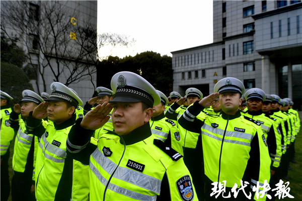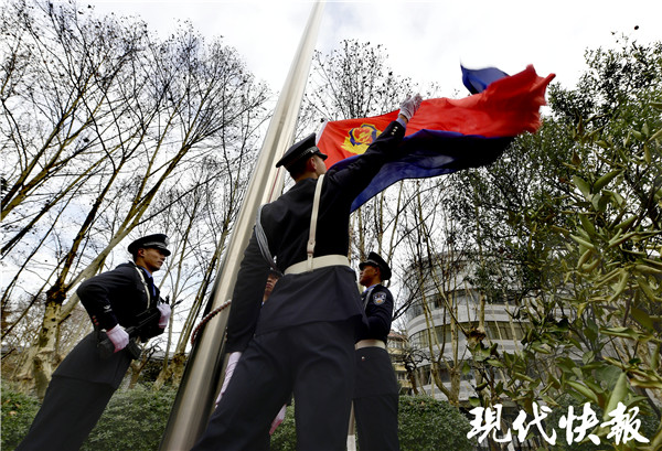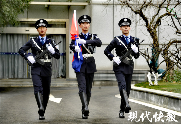 1月10日,室外零下5℃的寒風(fēng)里,來自江蘇省公安廳特勤局的警旗護(hù)衛(wèi)隊(duì)正護(hù)衛(wèi)著人民警察警旗,向公安廳大院的旗桿行進(jìn),中間的擎旗手手擎警旗,兩名護(hù)旗手分列左右,現(xiàn)場觀眾行注目禮。