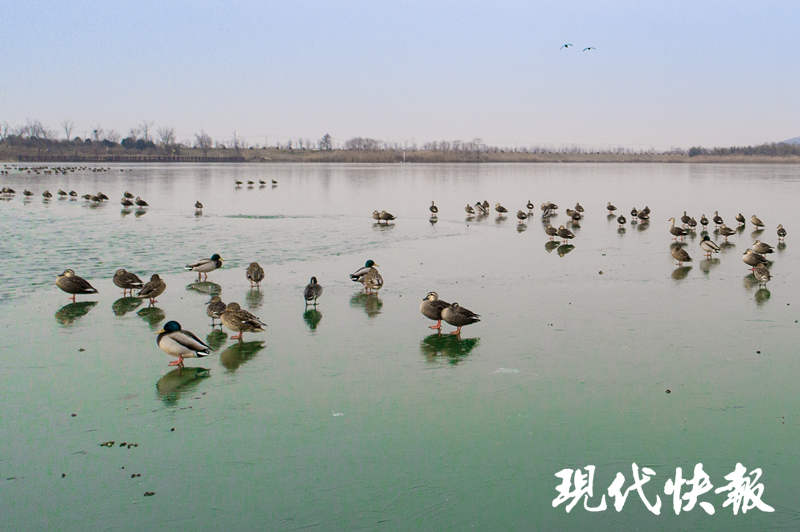 專家表示,每年10月至來年3月,都會有數(shù)萬只野生鳥類在赤山湖濕地越冬。赤山湖位于長江中下游地區(qū),像這樣大范圍結冰的情況并不多見,對于這些越冬的鳥類是一種嚴苛的生存挑戰(zhàn)。