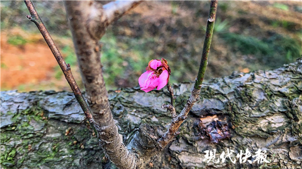 1月14日下午,現(xiàn)代快報(bào)記者在明孝陵梅花山博愛(ài)閣附近發(fā)現(xiàn)已有梅花綻放,零星的桃粉色花朵仙氣十足,嬌小的花骨朵含羞地藏在枝頭,等待陽(yáng)光來(lái)喚醒。
