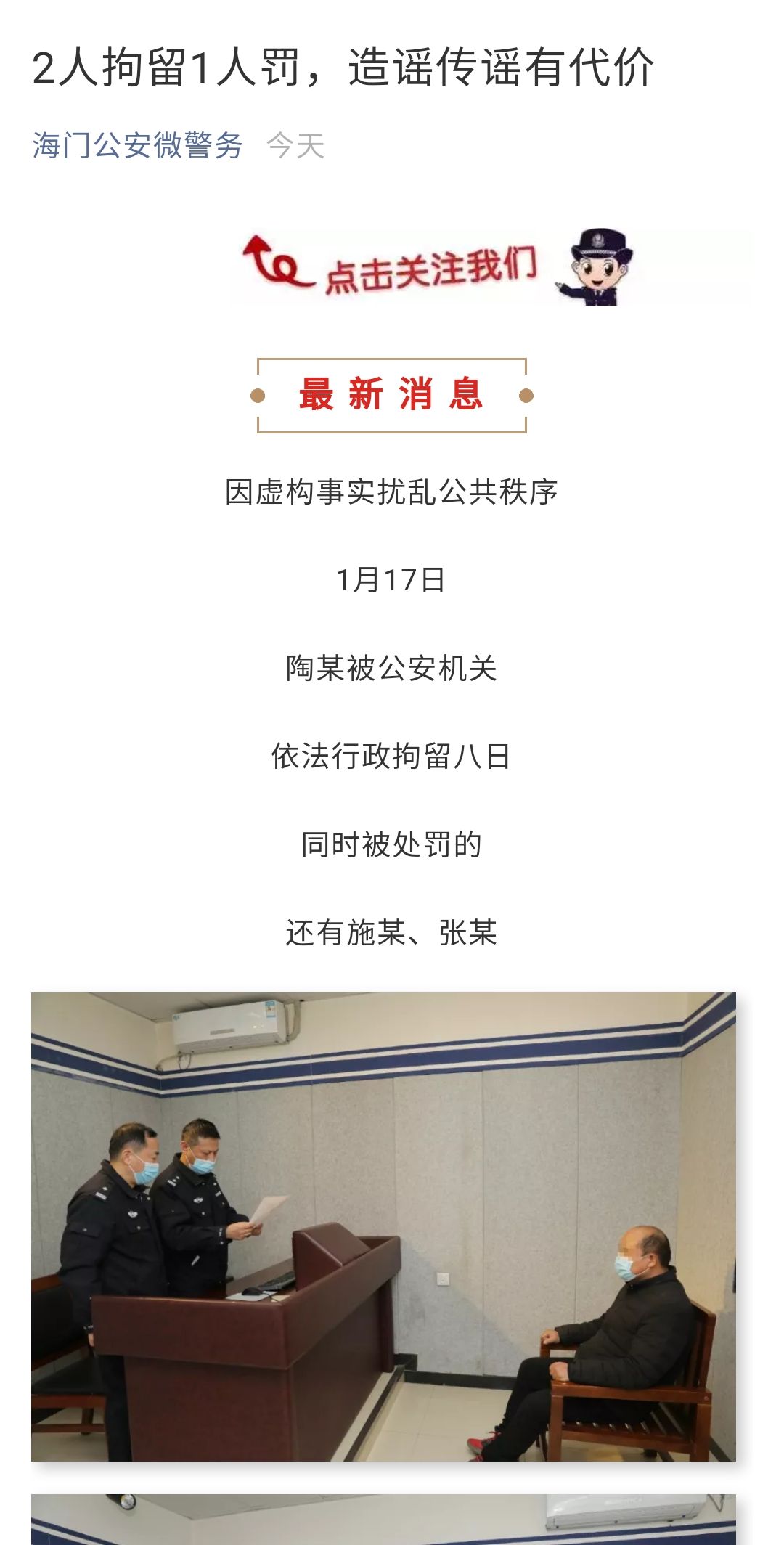 (記者 嚴(yán)君臣)1月17日,南通海門警方通過官方微信公眾號“海門公安微警務(wù)”發(fā)布一則消息。因虛構(gòu)事實(shí)擾亂公共秩序,1月17日,男子陶某被公安機(jī)關(guān)依法行政拘留八日,同時(shí)被處罰的還有兩名散播謠言的女子施某、張某。