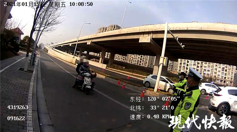 當(dāng)天上午,鹽城快速路大隊民警在青年路高架寶興路出口,查糾交通違法行為。10時許,一男子騎行電動車進(jìn)入查緝區(qū)。民警發(fā)現(xiàn)他沒有佩戴安全頭盔,并且存在違法載人行為,準(zhǔn)備對兩人進(jìn)行處罰。