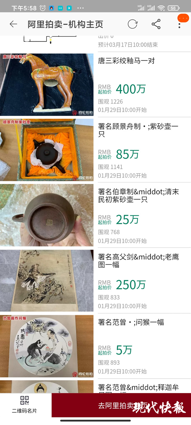 “這批拍賣品上架后,不少人設(shè)置了提醒,但是目前還沒有人現(xiàn)場來看。”院方告訴記者,本次拍賣的競價時間為1月29日上午10點至1月30日上午10點止,截至目前已有25人設(shè)置提醒,1217次圍觀。院方特別提醒,標的物要以實物看樣為準,法院不負責鑒定拍品真?zhèn)?,不承擔瑕疵及真?zhèn)伪WC。