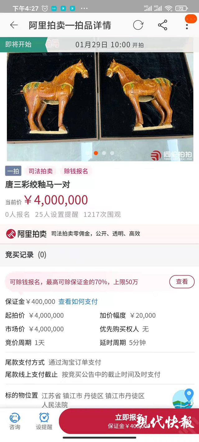 在丹徒法院的司法網(wǎng)拍頁面上,現(xiàn)代快報記者注意到,唐三彩絞釉馬為該批上架的物品中起拍價最高的一件,其高46cm*長44cm,起拍價400萬元,保證金40萬元,增價幅度2萬元。另一幅署名高父劍的老鷹圖也價值不菲,起拍價250萬元,保證金25萬元,增價幅度1.25萬元。此外,一件署名顧景舟制的紫砂壺起拍價也在85萬元,保證經(jīng)8.5萬元,增加幅度4250元;另有一件紫砂壺和兩件較小尺寸的字畫起拍價分別為25萬元和5萬元。
