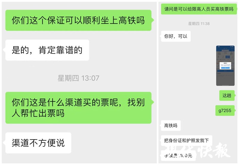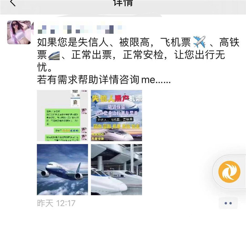 (記者 張瑾 陳子秋/文)“只要給錢(qián),肯定能給你買(mǎi)到,每張加1100元手續(xù)費(fèi)。”近日,被媒體曝光有黃牛從事給失信人買(mǎi)機(jī)票業(yè)務(wù)后,雖然多家聊天平臺(tái)都加強(qiáng)了監(jiān)管,一些個(gè)人及群名帶明顯“老賴代購(gòu)”等標(biāo)識(shí)的賬號(hào)基本都被強(qiáng)制注銷(xiāo),但現(xiàn)代快報(bào)記者發(fā)現(xiàn)仍有一些黃牛潛伏,只不過(guò)披上了一層“馬甲”。記者連日調(diào)查發(fā)現(xiàn),輸入“機(jī)票代購(gòu)、火車(chē)票出售”等詞匯,依然可以找到這些“黃牛”,這些黃牛宣稱有自己開(kāi)發(fā)的境外系統(tǒng),可以躲避?chē)?guó)內(nèi)征信系統(tǒng)的監(jiān)查,確保順利出票。其中有位黃牛聲稱,疫情期間,順利幫一位“老賴”從國(guó)外回國(guó)。