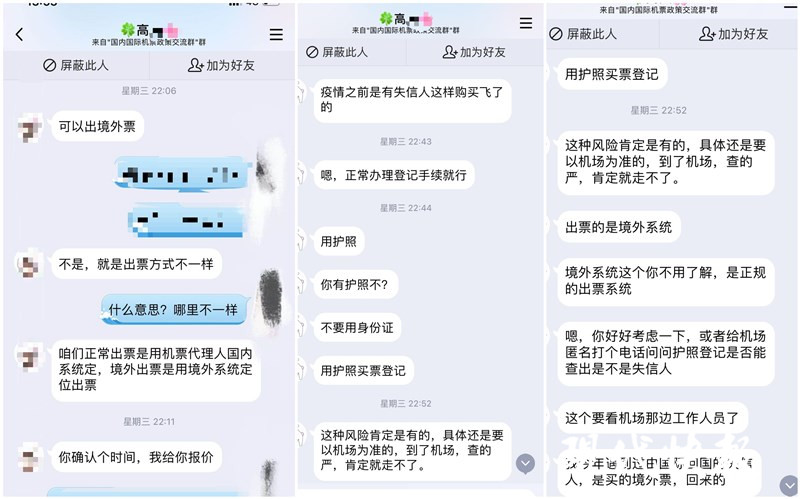 記者向黃牛詢問(wèn)購(gòu)票流程,黃牛聲稱是走境外渠道買(mǎi),“國(guó)內(nèi)有征信系統(tǒng),只能走國(guó)外,我們有自己的系統(tǒng)。”但當(dāng)問(wèn)及具體是什么方式時(shí),黃牛叫記者不要多問(wèn)。一位黃牛告訴記者,身份證是肯定買(mǎi)不了的,但是可以通過(guò)護(hù)照購(gòu)買(mǎi)。因?yàn)樽o(hù)照信息沒(méi)有列入征信系統(tǒng),但究竟能不能登機(jī)成功,還是要看機(jī)場(chǎng)查得嚴(yán)不嚴(yán)。“今年查的嚴(yán),再加上疫情的原因,國(guó)內(nèi)的幾乎沒(méi)走過(guò),不知道哪個(gè)機(jī)場(chǎng)風(fēng)險(xiǎn)小,無(wú)法幫你規(guī)避風(fēng)險(xiǎn)。”