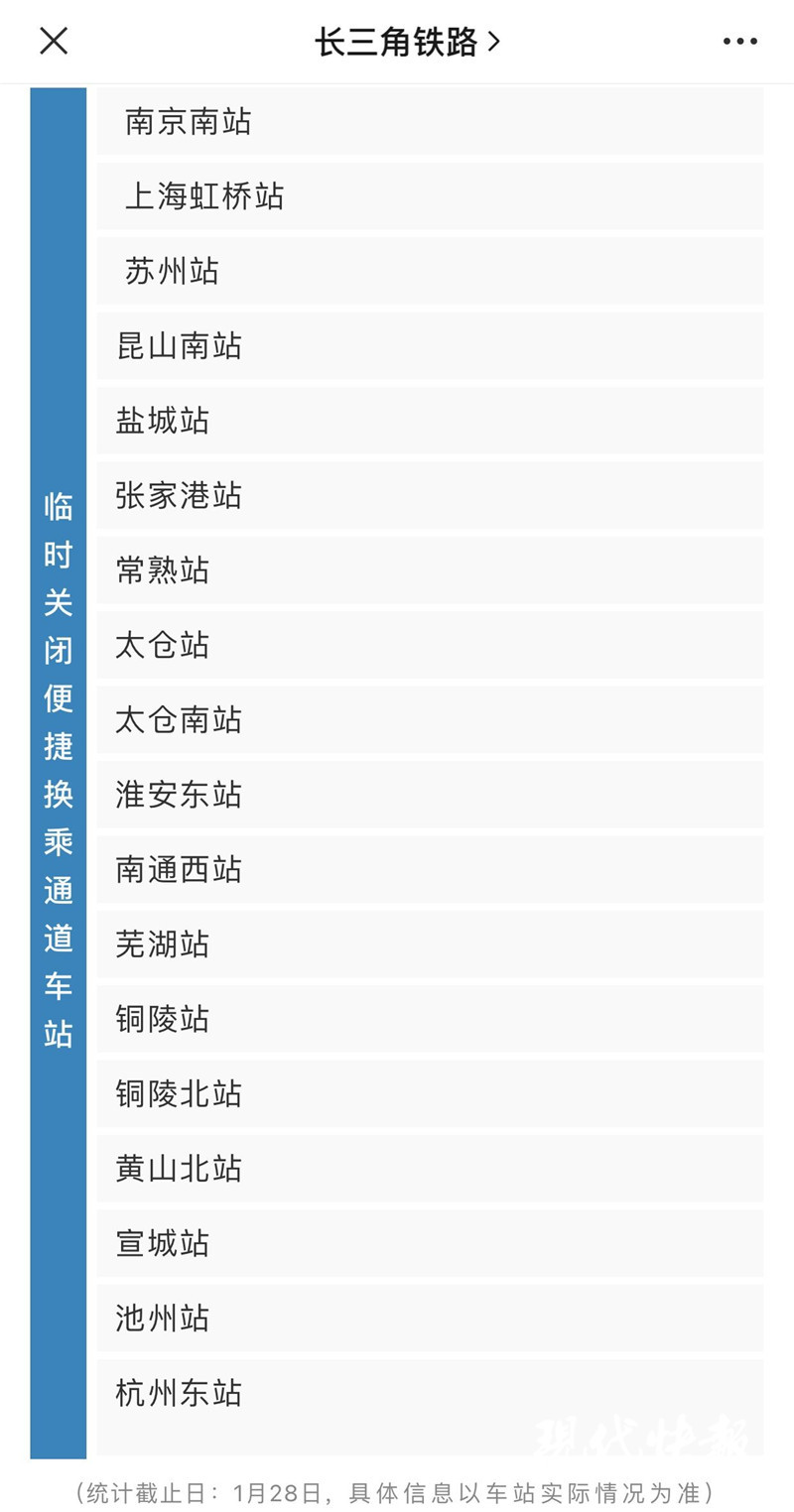 △長三角這18個火車站臨時關(guān)閉中轉(zhuǎn)換乘便捷通道。圖片來源:長三角鐵路