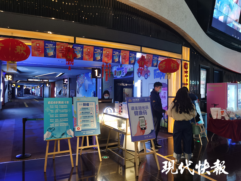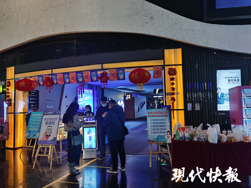 在江寧經貿路中數影城,影院負責人表示,他們每天每個影廳除了進行五次擦拭外,還有兩次由第三方保潔公司專業(yè)消毒。春節(jié)期間,按照防疫規(guī)定,影廳內不能攜帶飲料和食物。在南京萬達江寧影城,記者看到一對情侶在出示健康碼和行程碼,接受體溫檢測后,被工作人員引導將自己攜帶的飲料放在了一張長條桌上,桌上已經放滿了觀影者入場前“寄存”的零食和飲料。在新街口國際影城 ,有工作人員舉著“請戴口罩,勿食零食”的牌子在不停巡場。