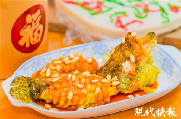 最后,在番茄醬里加入少量醋,等料汁冒泡后加入白糖攪勻,煮至湯汁粘稠,將番茄汁兒澆在魚身上,灑些松子點綴,一道松鼠鱖魚就閃亮登場了。李聯(lián)建說,春節(jié)期間,老蘇州人經(jīng)常將松鼠鱖魚和松糕搭配在一起,象征著年年有余,高高興興。