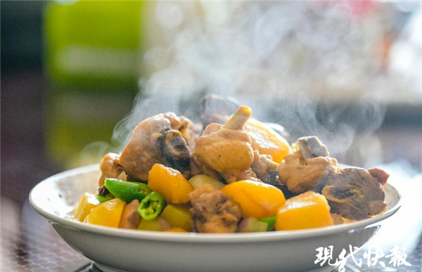對于“新蘇州人”康玉珍來說,春節(jié)餐桌上必不可少的是家鄉(xiāng)美食—大盤雞??涤裾涞睦霞以谛陆吞?,大盤雞是她最拿手的菜。“做大盤雞不要舍不得油,炸雞塊至少要半鍋油,再放入3顆草果、八角、小米椒,大約炸10分鐘再撈出來。”