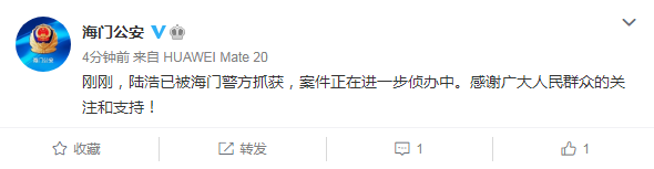 據(jù)海門警方18日下午發(fā)布,嫌疑人已落網(wǎng)。
