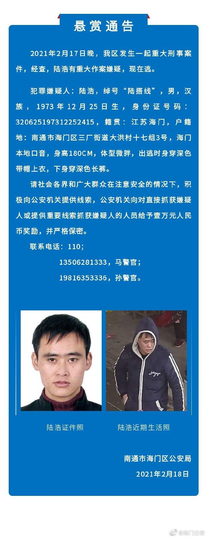 (記者 嚴(yán)君臣)據(jù)南通警方消息,2月17日晚,南通市海門區(qū)發(fā)生一起重大刑事案件,經(jīng)查,陸浩有重大作案嫌疑。案發(fā)后,公安機(jī)關(guān)向?qū)χ苯幼カ@嫌疑人或提供重要線索抓獲嫌疑人的人員給予壹萬元人民幣獎(jiǎng)勵(lì)。