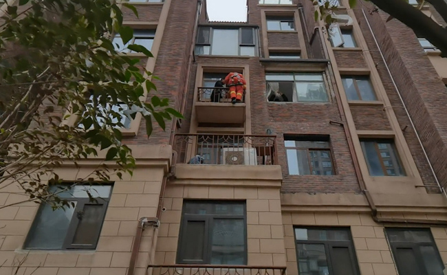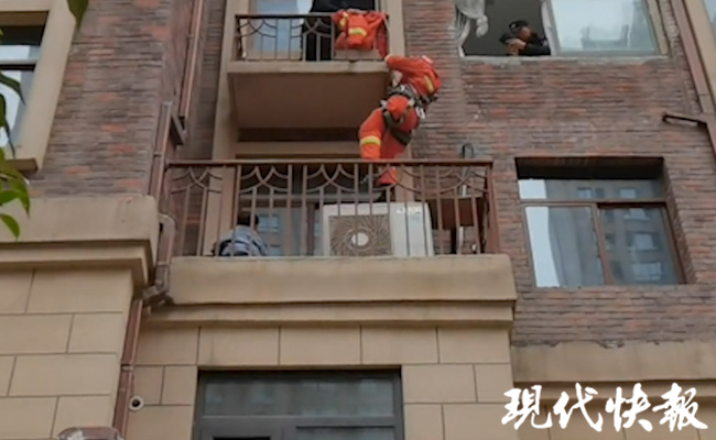 消防員趕到現(xiàn)場(chǎng)看到,3樓平臺(tái)上的男孩正坐在里面玩耍。因3樓住戶(hù)家中沒(méi)人,房門(mén)無(wú)法打開(kāi),消防員擔(dān)心孩子有可能再次出現(xiàn)翻越行為,于是立即利用繩索做好防護(hù)措施,從4樓男孩家降落至3樓小平臺(tái),確認(rèn)小孩并未受傷。