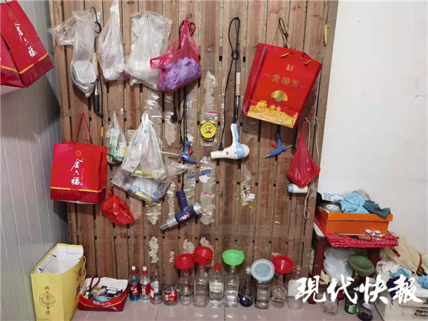 現(xiàn)代快報記者從天寧紅梅派出所了解到,民警在轄區(qū)走訪時,位于紅梅東村一個民房進入了社區(qū)民警的視線。據(jù)居民稱,該處民房周圍常散發(fā)著濃郁的酒味,但是民房長時間緊閉,很少看到有人進出。留了心眼后,社區(qū)民警著重針對該處進行走訪調(diào)查,發(fā)現(xiàn)這個民房內(nèi)有制售假酒的嫌疑后,及時上報。