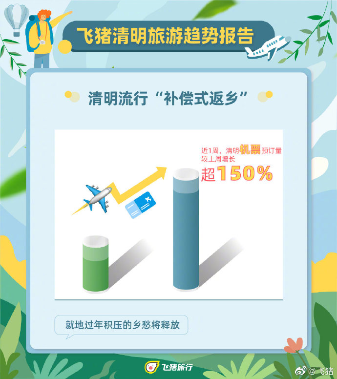 現(xiàn)代快報(bào)記者從飛豬旅行了解到,近一周,清明機(jī)票預(yù)訂量比上一周增長了150%,鄉(xiāng)村民宿預(yù)訂量較上周增長超165%,跨省長線游預(yù)訂量較上周增長超170%,北上廣等位列清明熱門入住城市全國前十。