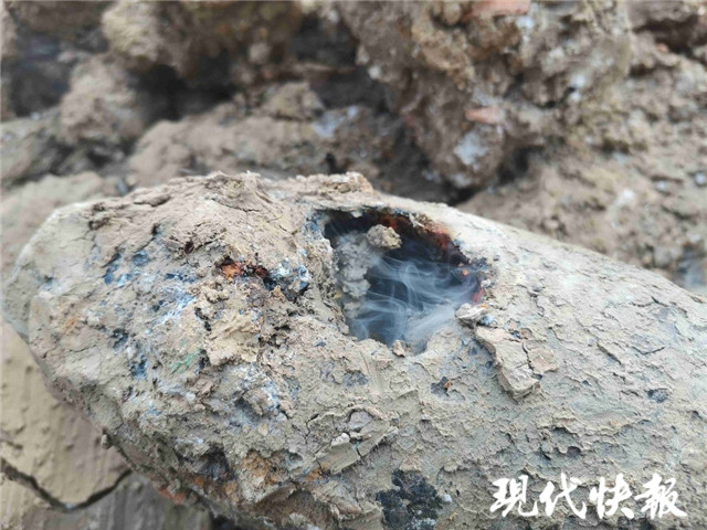 張琰來到在建工地,只見那枚炸彈正冒著白煙,還有著“滋滋”的燃燒聲。工人說,炸彈是被挖掘機從土里挖出來的,當(dāng)時挖機的抓手將炮彈挖破了,如果不是發(fā)現(xiàn)土里有煙冒出來,工人們也不會發(fā)現(xiàn)挖到了炸彈。