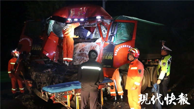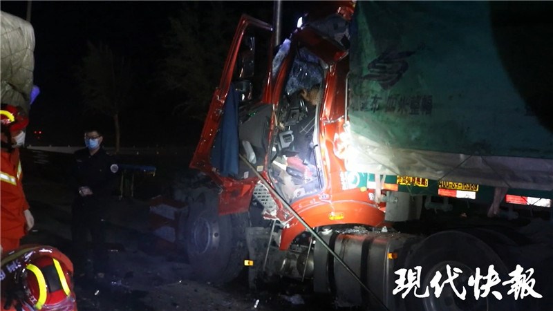 當天清晨4點32分,徐州睢寧縣慶安鎮(zhèn)251省道馬莊橋附近發(fā)生兩半掛車追尾事故,后車司機被卡車內(nèi)無法出來。接到報警后,睢河消防救援站出動1車6人趕赴現(xiàn)場。