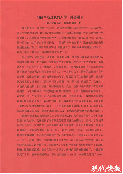 在收到趙青秀一筆筆還款的同時(shí),4月13日,江蘇科技大學(xué)電子信息學(xué)院也收到了一封趙青秀發(fā)來的近2000字的感謝信。信中她還原了自己借錢的始末。