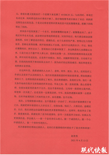趙青秀說,這兩年里,自己也學(xué)會(huì)了很多,最重要的是感受到了讀書的重要性。2019年5月,父親病情穩(wěn)定后,她很快就返回了學(xué)校。此時(shí)正值大三學(xué)生備戰(zhàn)考研的關(guān)鍵時(shí)期,準(zhǔn)備考研的趙青秀主動(dòng)申請(qǐng)擔(dān)任團(tuán)支書,希望為班級(jí)同學(xué)服務(wù)。由于準(zhǔn)備不夠充分,趙青秀第一次考研失利,但在父母的支持下,她選擇了“二刷”。今年,趙青秀如愿收到了河南科技大學(xué)的研究生錄取通知。“讀書一方面是學(xué)習(xí)知識(shí),但更重要的是學(xué)會(huì)做人——做一個(gè)富有責(zé)任心的人,做一個(gè)誠信的人,做一個(gè)心懷感恩的人,做一個(gè)理智明理的人。”她說:“最黑暗的時(shí)候已經(jīng)過去了,感謝曾經(jīng)幫助過我的人,是你們給了我光明和希望。”