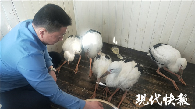 “這不是天鵝,是國家一級保護動物東方白鸛,1只能行走,其余4只奄奄一息,而且生命體征很差。”九龍口濕地保護科的專家確認后表示??吹竭@個狀況,濕地保護科的工作人員當(dāng)起了新“媽媽”,對東方白鸛進行檢查,發(fā)現(xiàn)沒有任何外傷,隨后到河里捉來小魚投喂。
