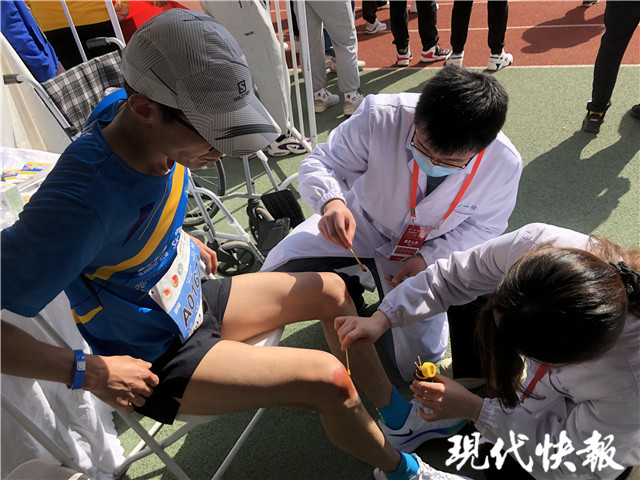 現(xiàn)場(chǎng),穿著白大褂的醫(yī)務(wù)人員一直沒閑著。他們站在跑道旁邊,給抵達(dá)終點(diǎn)的選手遞水遞毛巾,看到有的選手不舒服或者膝蓋等地方破了,立馬給他們進(jìn)行治療、傷口處理。