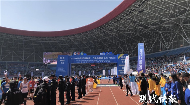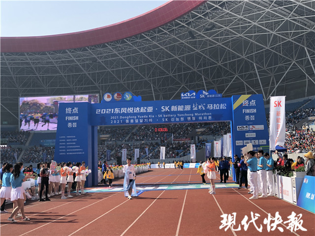 “半程馬拉松第一名即將抵達(dá)終點(diǎn),請(qǐng)?jiān)趫?chǎng)的觀眾一起為他加油吶喊!”在終點(diǎn)——鹽南體育中心體育場(chǎng),隨著主持人對(duì)賽況的持續(xù)播報(bào),現(xiàn)場(chǎng)的觀眾歡呼著迎接半馬第一名沖線。