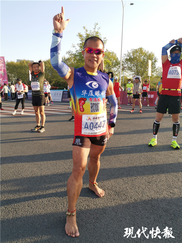 “這是我參加的第158場馬拉松,他們都叫我赤腳大仙,因為光腳跑更接地氣,能感受自然,腳脖子上系的鈴鐺也是保佑平安。”在馬拉松起點,來自廈門的李清模正光著腳做賽前準備。他告訴記者,每一場馬拉松他都光著腳系著鈴鐺,希望自己能取得較好名次。