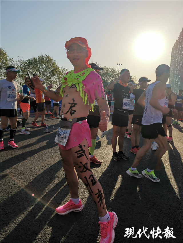 一名渾身寫滿“武漢歸來”“牢記使命”“加油”字樣的男子吸引了不少人的目光。他告訴記者,他已經(jīng)參加了百余場馬拉松,身上的字是自己彩繪的,這次從武漢來淮安參賽,其中一個原因就是感謝江蘇人對武漢人民的援助。他知道淮安是周恩來總理的故鄉(xiāng),趁著鍛煉身體的好機會,正好領(lǐng)略淮安的美好風(fēng)光。