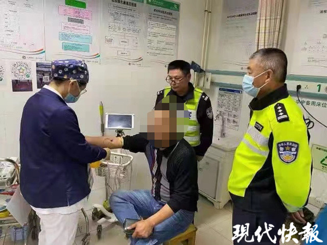交警追出大概200余米到了三陽(yáng)橋上時(shí),駕駛?cè)送蝗煌A讼聛?,一只腳跨過橋欄準(zhǔn)備跳河,驚險(xiǎn)時(shí)刻,交警加速?zèng)_上去一把拉住。