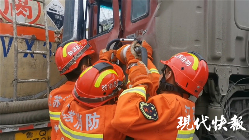 當(dāng)天11點半左右,在徐州市新沂205國道高流石澗段,一輛半掛車追尾一輛槽罐車及貨車,槽罐車內(nèi)是液堿有腐蝕性,半掛車司機(jī)被困。接到報警后,新沂大橋路消防救援站立即調(diào)派1輛搶險救援車和1輛水罐車及12名消防員前往處置。