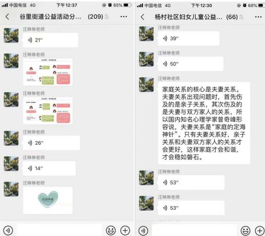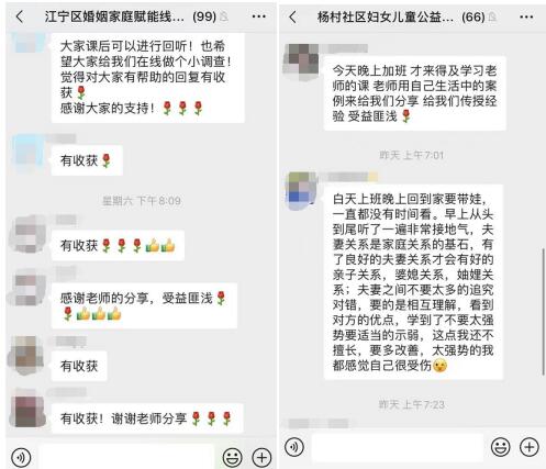 本次課程通過語音、圖片、文章、視頻相結(jié)合的方式在線與大家進行講解,著重介紹了夫妻關(guān)系在整個家庭中的重要性,圍繞如何經(jīng)營和諧婚姻關(guān)系、如何處理家庭關(guān)系沖突、建立婚姻心理健康等方面進行講解,引導(dǎo)居民正確處理好婚姻、家庭關(guān)系,學(xué)會在生活中互相信任、理解、包容和尊重對方。汪老師通過發(fā)生在身邊的案例和大家一一分析矛盾產(chǎn)生原因、解決的辦法以及今后生活中應(yīng)該如何經(jīng)營家庭關(guān)系等方面進行講解,用通俗易懂的方式幫大家了解婚姻家庭的經(jīng)營之道。